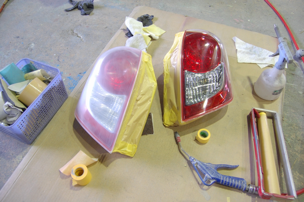 こちらもお待たせしております。トヨタラクティスのテールランプですね。画像は足付け処理中の状態です。