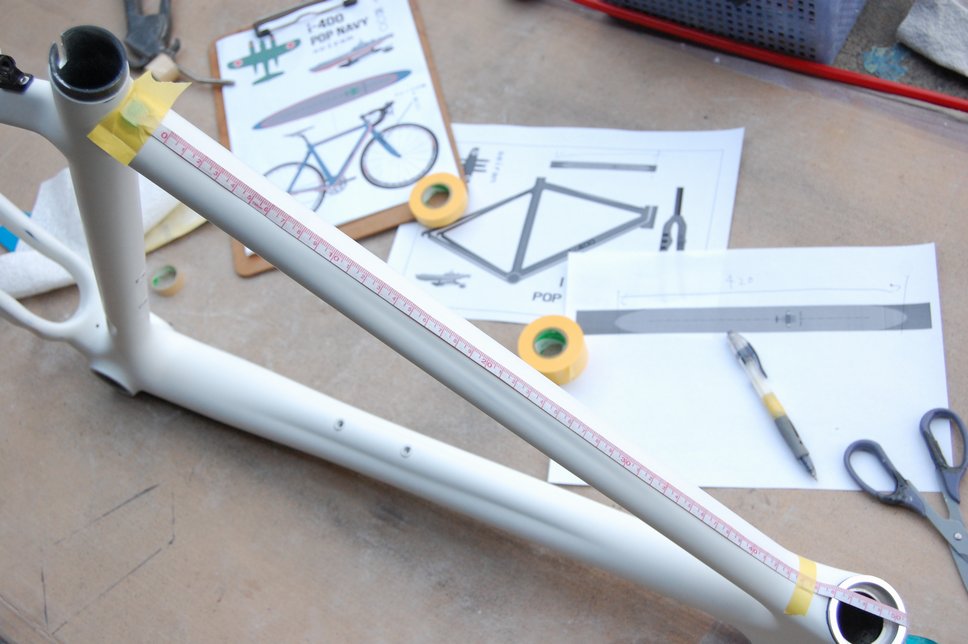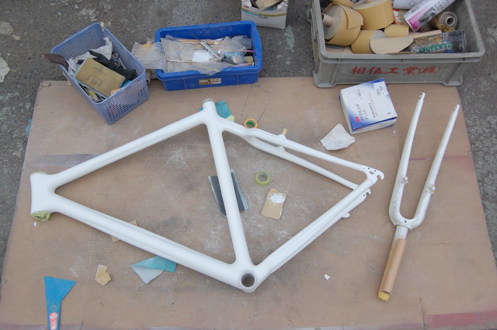 トップチューブについていたアルミ製のワイヤーガイドはリベットを外して取れましたので障害物も無くフラットに出来ました。面倒な作業ほど下準備に時間を掛けるのは鉄則ですよね(って言う程大袈裟な事では無いですが・・・)。
