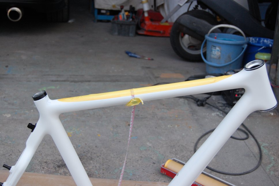 そしてイメージし易いようにマスキングテープを貼ってみました。随分と酷い形ですがあくまでイメージですので気にしないで下さい。本番ではちゃんとパソコンでマスキングシート造りますから完全なシンメトリーになる予定です。ただしそもそもフレーム形状がシンメトリーじゃないみたいですけどね(私的見解ですがカーボンフレームはみんなそうです)。