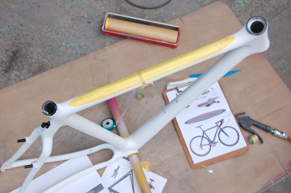 で、完成のイメージ画像がこんな感じです。トップチューブの滑走路的なイラストはもうちょっと長く広げるような感じですかね。案ずるより生む方が手っ取り早いので実際にマスキングテープで表現してみる事にします。