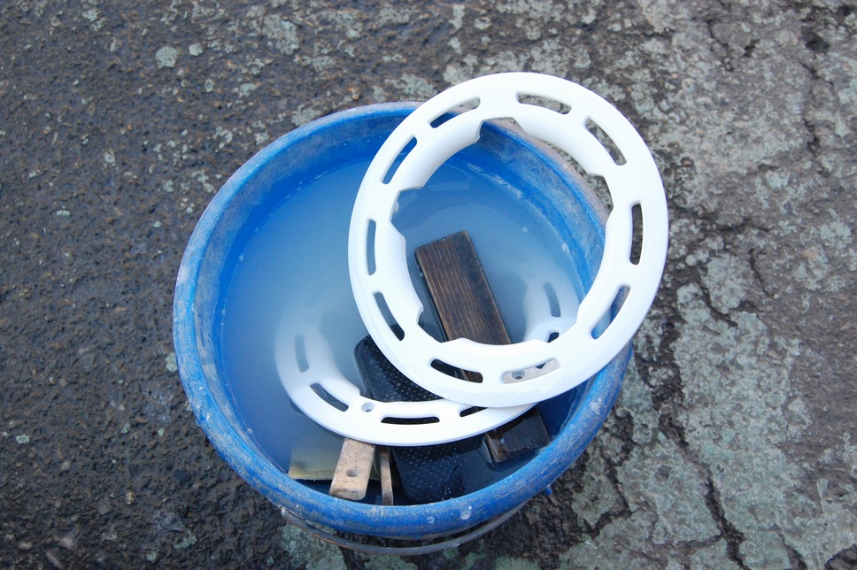 先日サフェーサーを塗っておいた自転車のチェーンカバーです。サフェーサー表面を#600→#800の水研ぎで均したら綺麗に洗い流して乾かしておきます。
