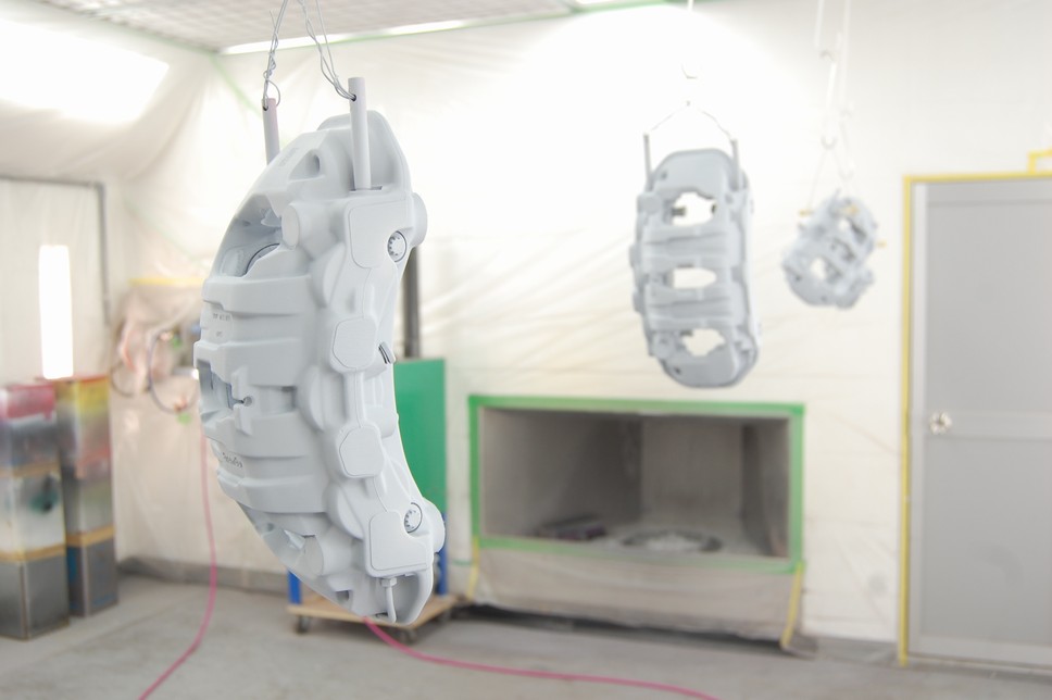 ブレンボの純正塗装が剥がれているのは大抵は「層間剥離」で、その原因は恐らく下色を塗った後に一度焼き付け、時間が経ってからそのまま足付け処理無しでクリアーを塗っているからだと思います。焼付け型塗料は密着性は良いのですが、それを過信してしまう為か下地処理無しで(プライマー塗装無しで)塗ってしまうケースをよく見かけます。そういえば職業訓練学校に来てくれていた金属塗装の講師の方も言ってました。「大量生産品ではそこにコストは掛けられません」と(苦)。