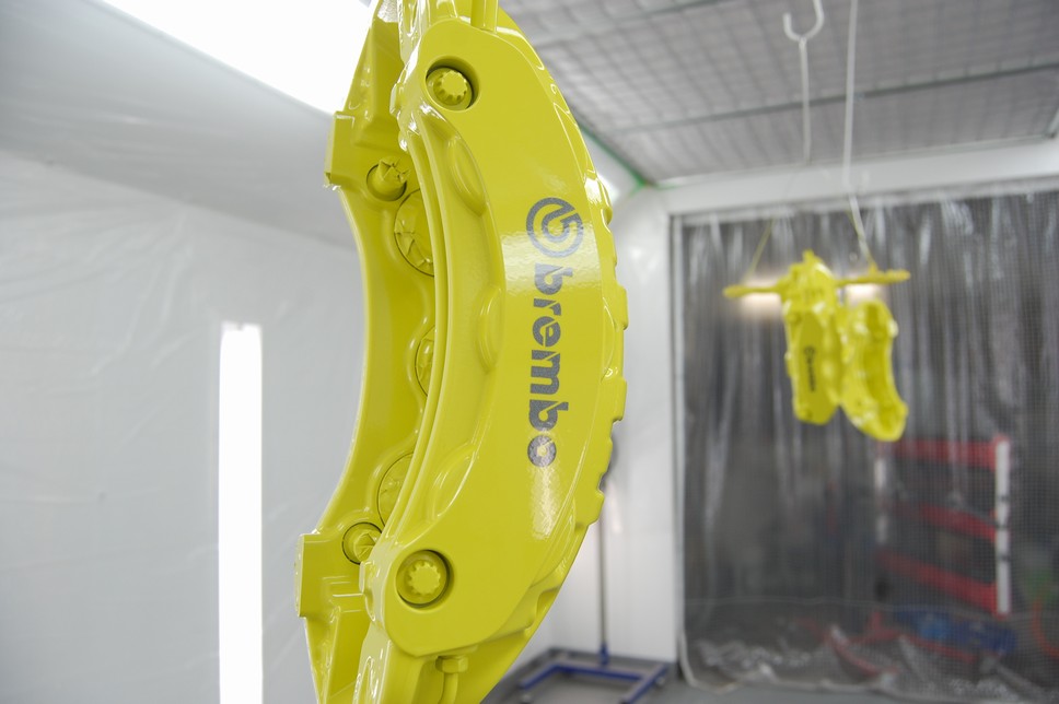 使っている塗料は特にキャリパー専用の塗料と言う訳では無くいつものスタンドックスです(2液ウレタン塗料です)。「キャリパー専用塗料じゃなくて大丈夫なの?」と思われそうですが、むしろキャリパー程度であれば特に問題は無いと考えています。先日も以前塗装をご依頼頂いたランサーのオーナー様から別件でお問い合わせがあり、サーキット走行で使っていても全く問題無いとの報告を頂きました。ちなみに走行会レベルでは無くタイムアタックをしている程の使い方で、記憶が間違っていなければ確かコスワースのエンジンに載せ買えてコースレコード持っている程だったと思います。剥がれたりしていないのは勿論、色焼けも無いとの事で驚いていました。