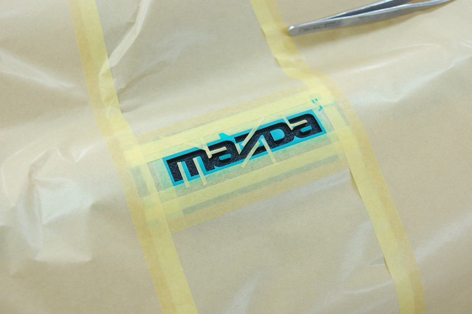 先日結晶塗装を終えていたロードスターの「凹み文字」に色を塗ります。まずは以前作成していたデータを使ってマスキングシートを作成します。