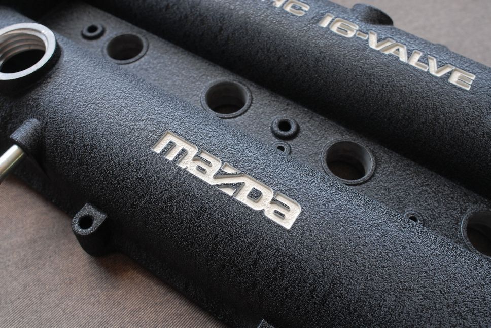 大変お待たせしました!ユーノスロードスターのヘッドカバー、黒の結晶塗装+凹み文字塗装完成となります。