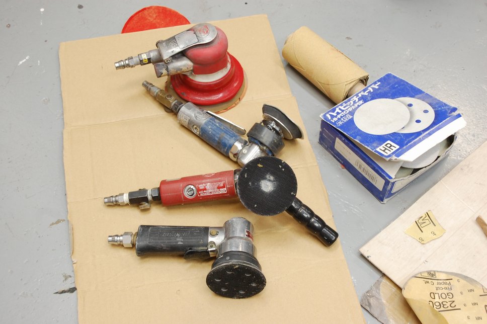 と言う訳で旧塗膜の剥離は物理的な方法となったのですが、さすがにあの厚膜を手研磨で削るのは大変過ぎますのでこういった場合はエアーツールを使いますが、今回の鍵のように窪んだ部分を削る場合には一般的な125mm径のサンダー(画像奥のです)だと届かないので径の小さいサンダーを使うのが一般的です。75mmくらいですかね(多分)。動き方はシングルだったりギアーアクションだったりダブルアクションだったりと用途によって使い分けます。