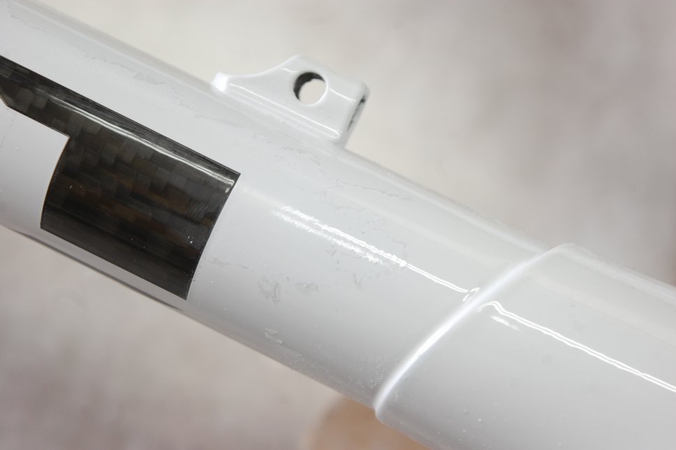look2通常はチューブ同士の継ぎ目にサービスホール(穴)が開いているのですが、今回のフレームはそれぞれが閉じてしまっているので、リベットやブラインドナット(ボトルゲージのネジを固定する受け部)を外した際に生じる破片を回収出来ないのです。