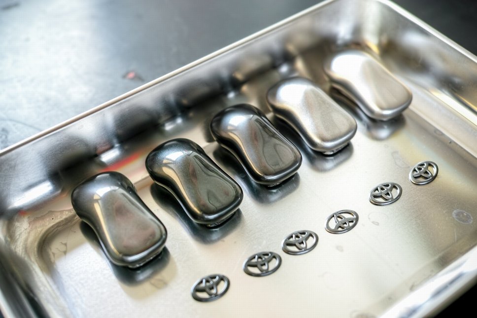 トヨタのエンブレムは各色の仕様で作っていて、ボタンに入れるロゴの色に合わせて選ぶ予定です。車型の方は色サンプルとして作った物で、これらは余り結果が芳しくなかったので現在新たに検証中です(まだやるのかって感じですが…)。