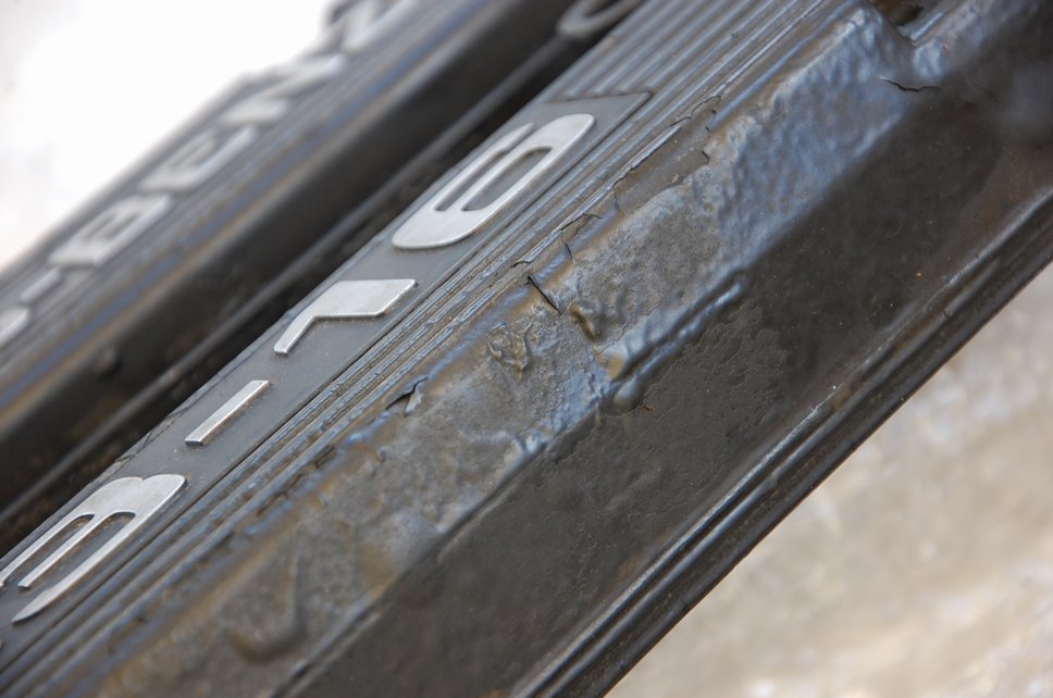 こちらもW124のヘッドカバーと同様、素材がマグネシウム(寄り)なので経年で腐食が激しく発生するのが特徴です。塗料が垂れているように見えますがそうでは無く、浮いて中が空洞になっています。