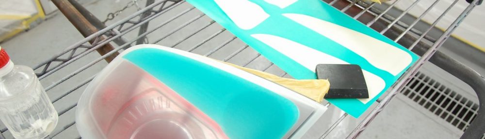 良く脱脂清掃し、予め用意しておいたマスキングシートを水で貼り付けます。一応ゴムベラで扱きますが、ドライヤーなど当てて水分を完全に飛ばさなくて大丈夫です(むしろ糊が残って大変な事になります)。