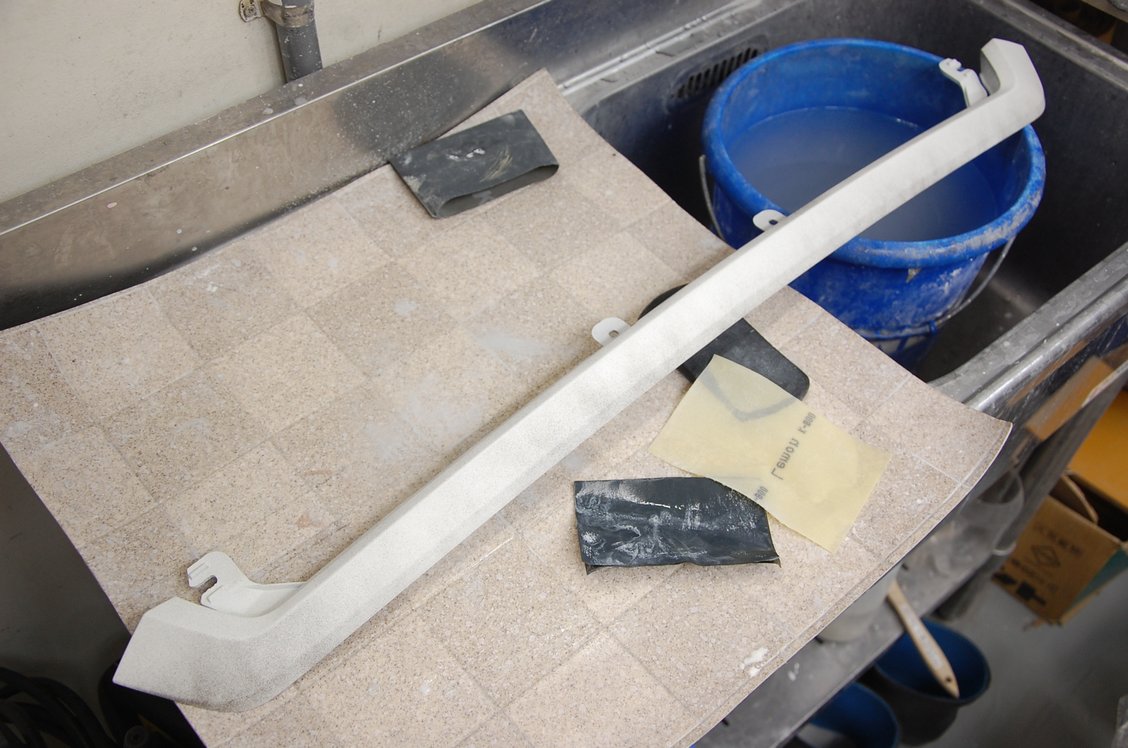 サフェーサーの表面にはガイドコートとして黒をパラパラとドライコートし、それを目安に研ぎ付けます。今回は特にラインのズレは無いので#800の水研ぎと、その後布状の研磨副資材(アシレックスレモン)でペーパー目を均します。