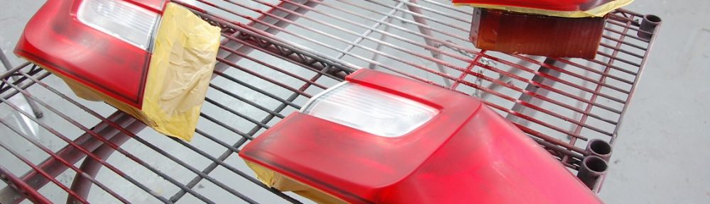 テールランプもそうですが、小物を塗装する場合は塗り肌(新車肌)を再現する必要が無く、むしろ肌の無い仕上りにしたい為、クリアーと被塗物とのガン距離はかなり近づけて塗っています。ガン距離が近ければ被塗面に塗着したクリアー中の溶剤が多く残り、その分レベリングが良くなって肌目の無い仕上りになります。