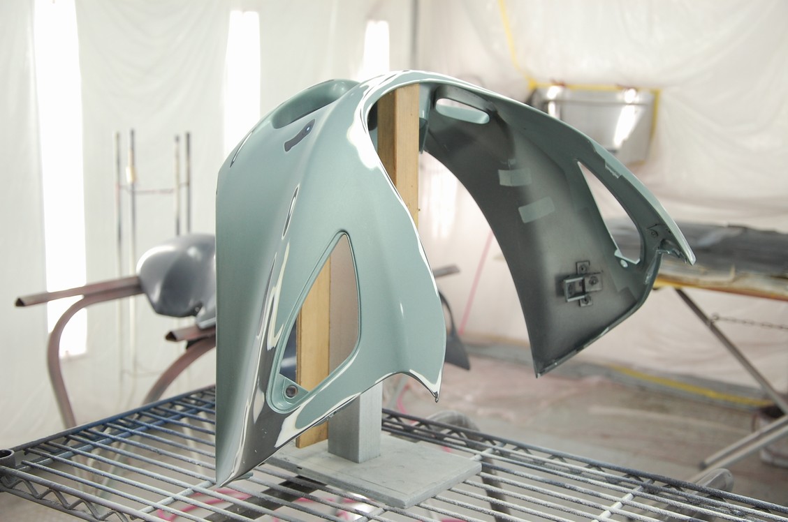 この後60℃40分程の熱を掛けてサフェーサーを完全硬化させ、サフェーサーを研いだら次はいよいよ本塗り工程です。今回は2色でご依頼頂いておりますので、まずは一つだけ色の違うロアカウルから塗ろうかと思っています。