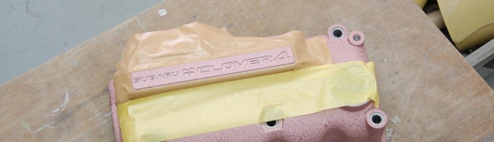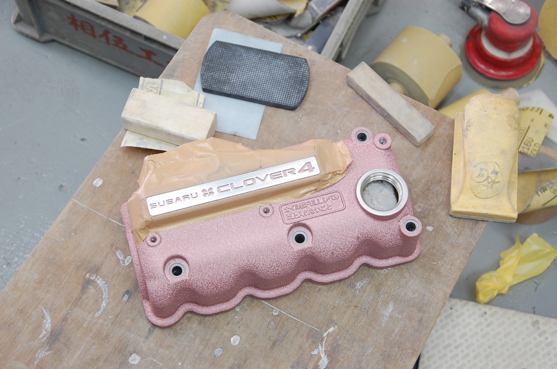 先日塗装を終えていたスバルサンバーのヘッドカバーです。その後2度焼きを行ってしっかり焼き締まりましたので、凸面を研磨します。