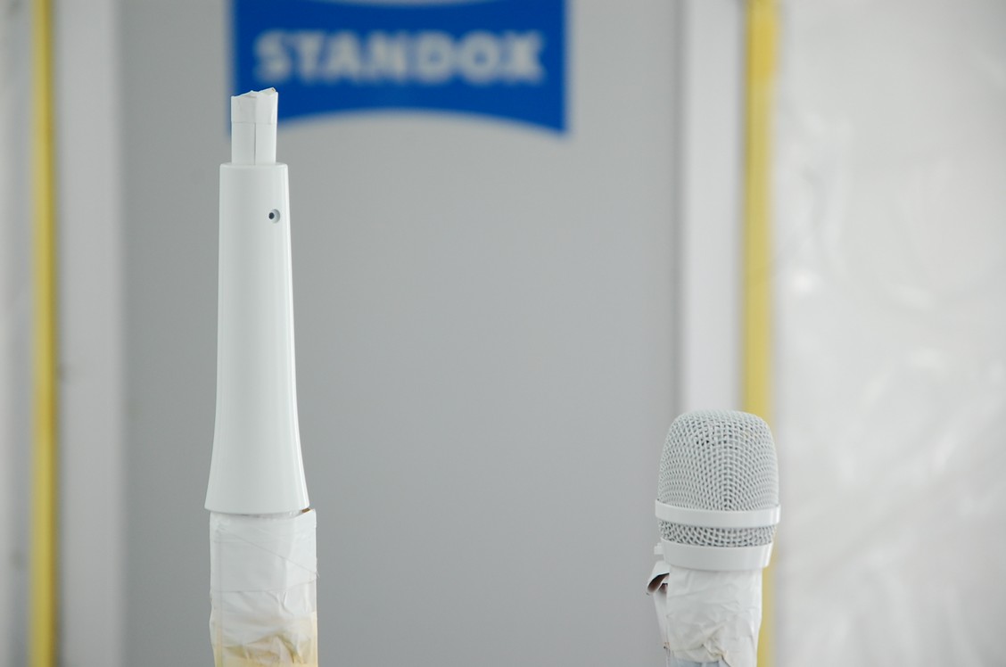 現在こちらの他にプロのバイオリニストの方のマイクも並行して作業していまして、そちらはマイク本体はブルーメタリック(パール)なのですが、グリルボールの網部分だけを「マットホワイト」といった仕様になっています。当然ですが艶ありのクリアーと艶消しのクリアーは同時に塗れないので、そちらは二回に別けての塗装となっています。