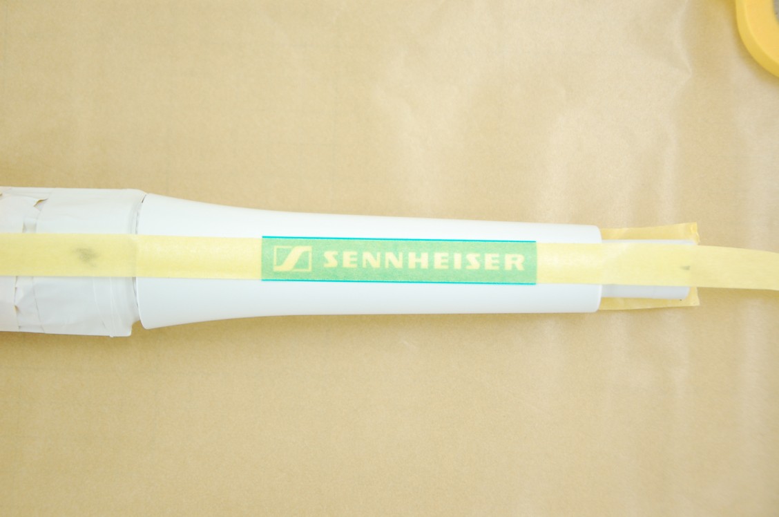 その後SENNHEISERのロゴにカットしたマスキングシートをセンターに貼り付けます。ネジがある丁度反対型です。