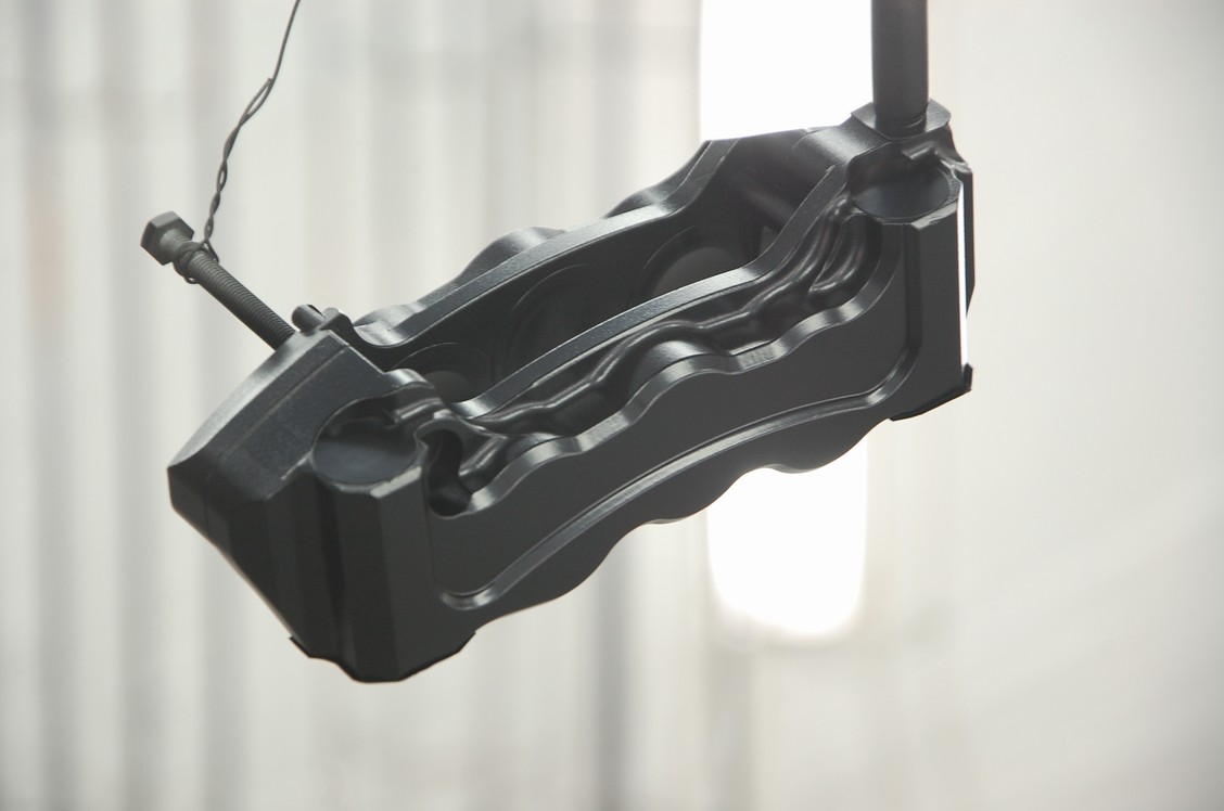 このキャリパ―の形状からして、いつものように吊るして塗ると恐らく綺麗に塗れない(あの段差でクリアーが垂れるか、またはロゴ部分の肌が悪くなる)と思った為、今回のメインとなるロゴ部を上面にして塗る事にしました。丁度ネジ穴があったので全ネジ(全部がネジ山になったスチール製の棒)で支えています。