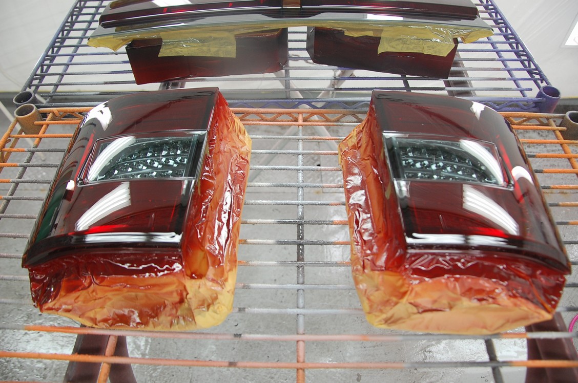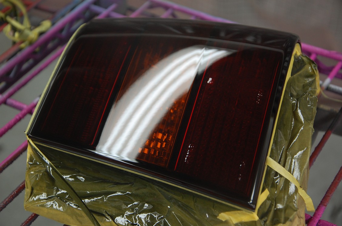 テールランプをそのまま台に置くと横に寝がちになってクリアーが垂れ易くなる為、下にマスキングテープの芯などを止めて塗り易い(クリアーが綺麗に仕上り易い)位置になるようにしています。当店の塗装は派手な物は無いのですが、「やっておくと良くなるかも知れない」みたいな細かい事を沢山積み重ねて仕上げています。
