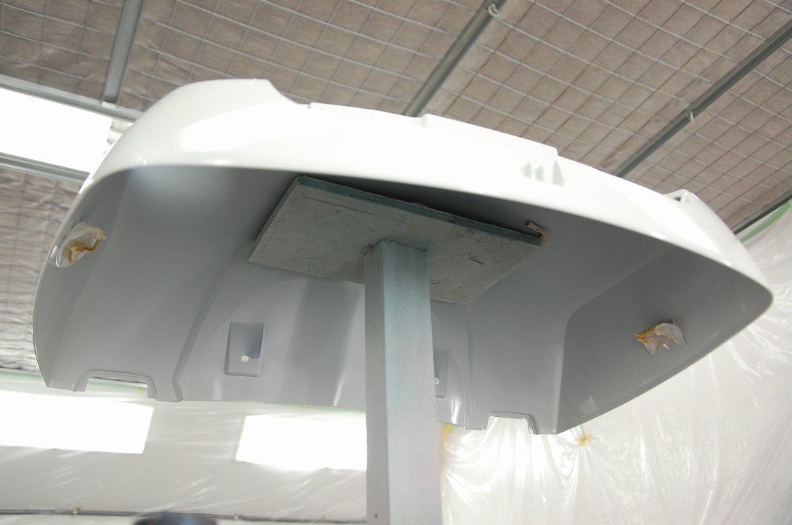 STANDOXの白は隠蔽力が弱いので、下色として3コートしっかりウェットに塗り、最後に調色済みの白を1.5コート(1ウェットコート+連続してミッドコート)塗り込みます。