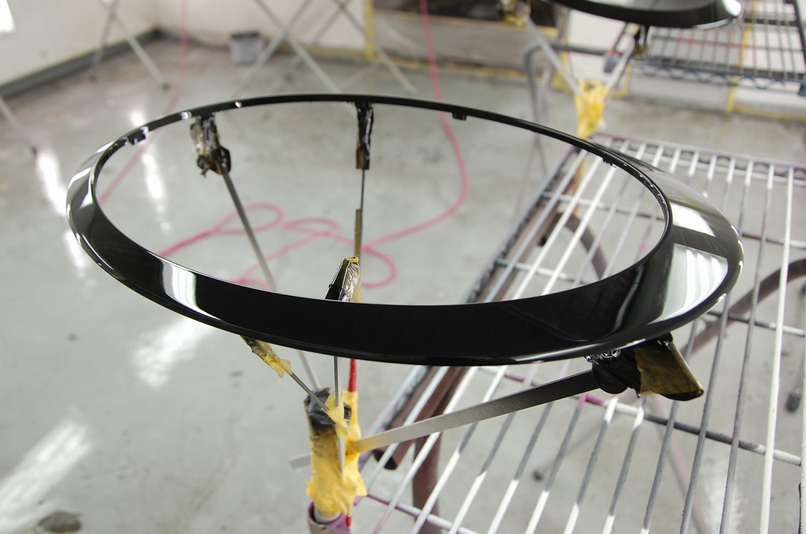 自動車の車体を塗っていた頃は台の上に直置きで塗っていましたが、小物塗装専門になってからはフチから裏側までしっかり塗れるこの固定方法になりました。部品が車体に装着された状態なら裏側は見えませんが、部品単体でお渡しする今のスタイルだと裏側までしっかり見られてしまうので、見えない所にまで気を遣うようになりました。普通は経験を重ねる毎に仕事が楽になると思うのですが、うちの場合はまるで逆です(苦)。