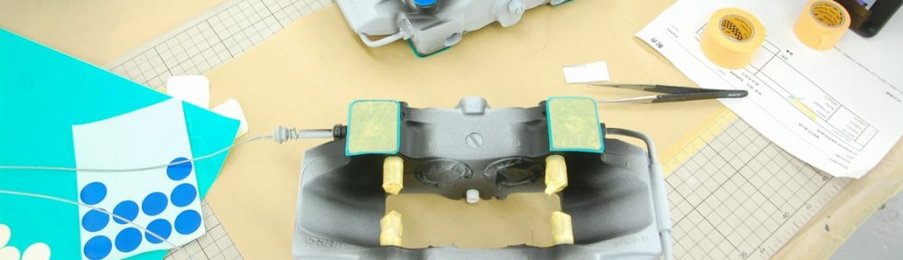 パッドを固定するシャフトを通す穴も、そのまま色(クリアー)を塗ってしまうとクリアランスが無くなって入らなくなる為、そこもマスキングをしています(ここを塗るとブレーキ屋さんが「入らないよ!」と凄く怒ります)。