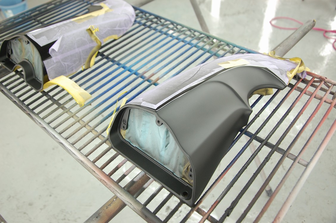 先日艶ありの黒とYAMAHAの凹み文字部を塗装していたYAMAHA VMAXのダミーダクトカバーです。少し時間が空いてしまいましたが、塗ってから直ぐにマスキングテープを貼るとその跡が残ってしまう事があるので、その後二度焼きをして寝かし、さらに磨き処理も行っておきました。一部ペーパーが当たったままの個所は、この後艶消し黒に塗装する部分なので磨き(コンパウンドを使ったポリッシュ)をする必要が無いからです。