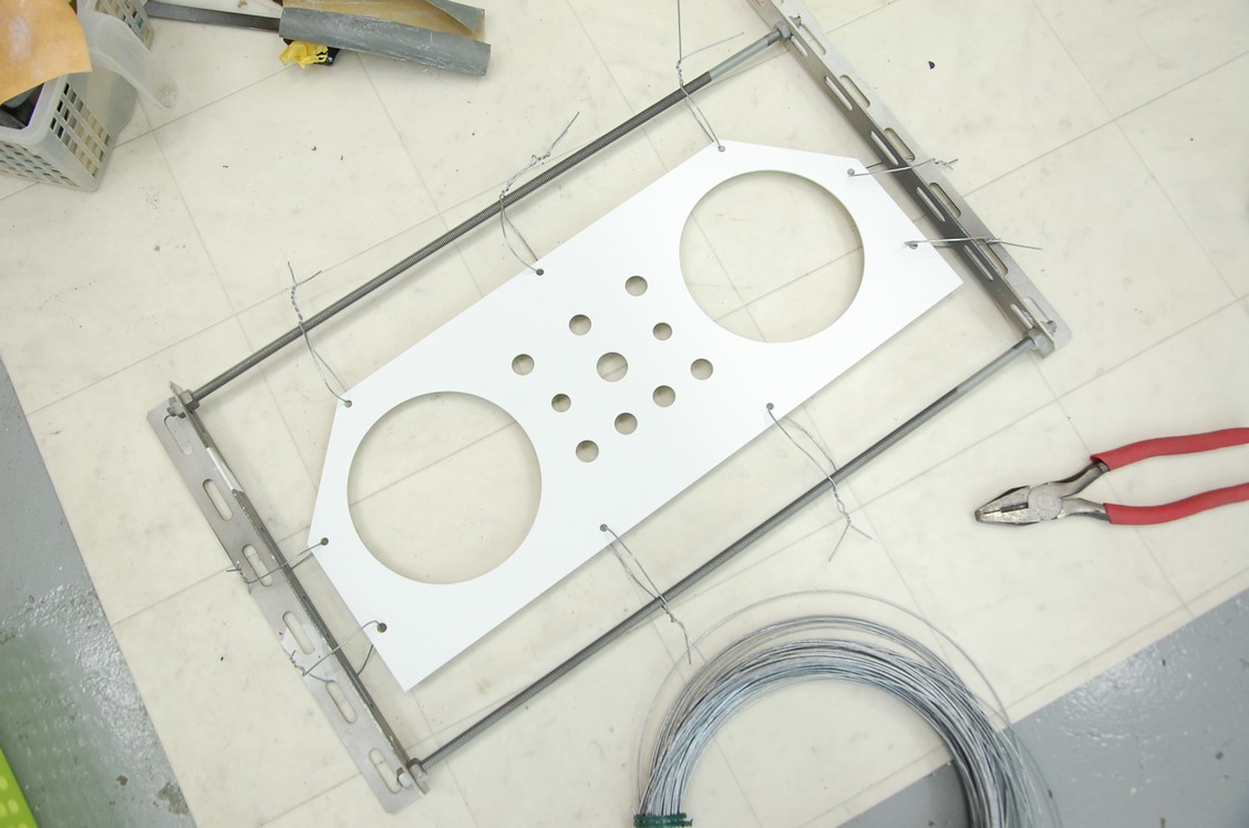 単にS字フックに引っ掛けて吊るすだけだと、スプレーガンのエアーで揺れてしまい気になって仕方がないので、全方向から番線で固定して左手でフレームを掴みながら塗ります。
