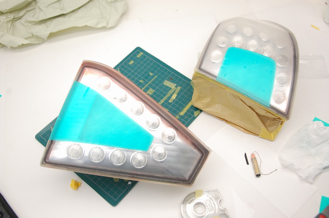 その後、各レンズのマスキングシートを作成・準備します。Valenti社製のインプレッサ用テールランプは、外側(クォーターパネル側)は純正と同じ型がそのまま使えました。