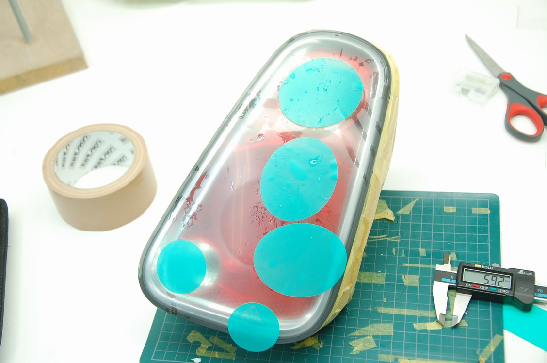こちらはBMW MINIの純正テールランプで、同じようにしてウィンカー部分とバックランプ部分のマスキングシートを作成します。