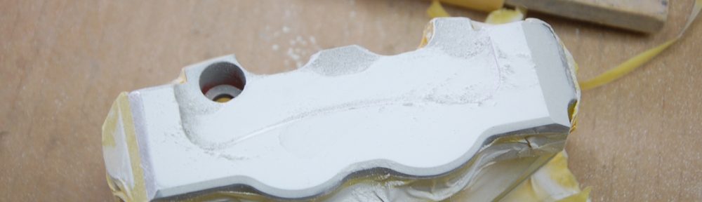 先日サーフェサーを塗っておいた、VMAXに装着予定のBERINGERブレーキキャリパー(リヤ用)です。その後60℃40分程の熱を掛けて塗膜を硬化させ、サフェを研いでおきました。