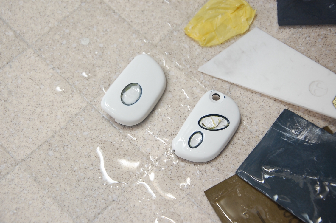 先日サフェ入れを行っておいたマセラティの純正リモコンキーカバーです。その後60℃40分程の熱を掛けて塗膜を硬化させ、表面にはガイドコートとしてベースコートの黒をパラパラと塗っておきました。