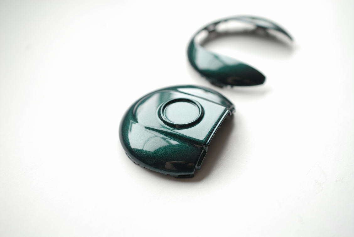 枠はABS樹脂に装飾クロムメッキが施されているので、下地処理をした上で艶ありの黒に、また今回はエンブレム本体のアクリル樹脂部分にスモーク塗装を承っています。これは当店としては初ですね。