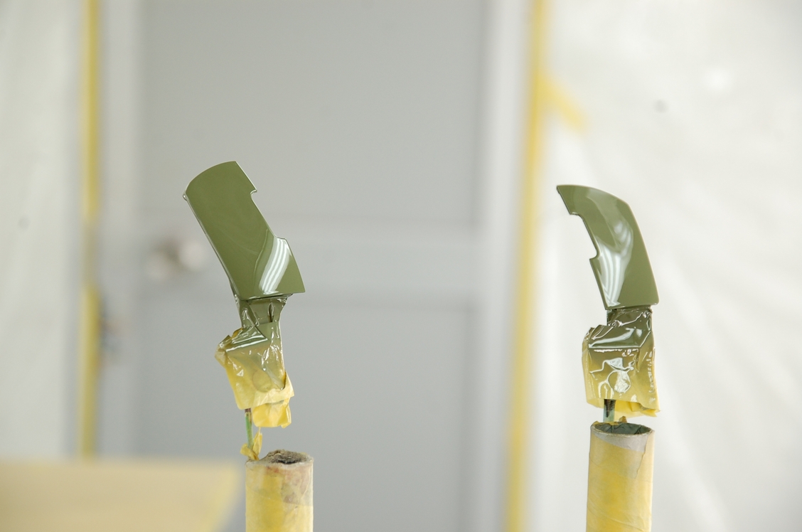 尚、今回は「艶消し」で承っておりますので、この時点ではまだ下塗りとなります。この後は再び熱を掛けて塗膜を硬化させ、ロゴ周りの段差を平滑にし全体の足付け処理、そして最後に艶消しクリアーを塗布します。