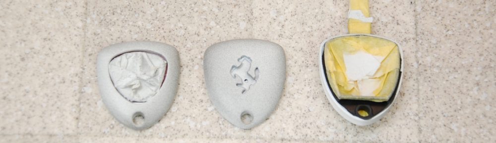 先日サーフェサーを塗っておいたフェラーリカルフォルニアの純正リモコンキーです。その後60℃40分程の熱を掛けて塗膜を硬化させ、ガイドコートとしてベースコートの黒をパラパラと塗っておきました。