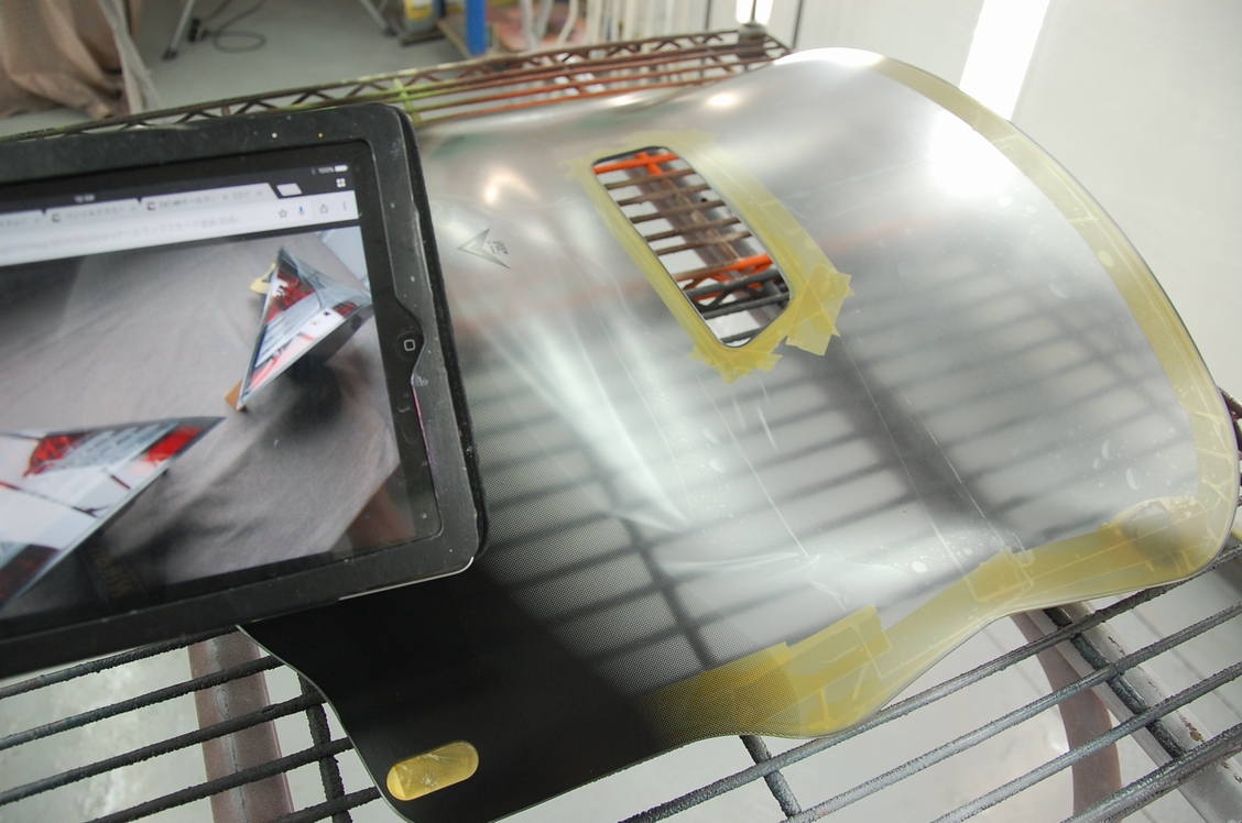 マスキングはボンネットを塗る時と同様、裏のプレスラインの内側ぎりぎりのところでブツ切りに、また二回目のクリアーを塗り終わった後に直ぐに剥がす事で段差が滑らかになるようにしています。またフチ(断面)はしっかりクリアーを塗っています。