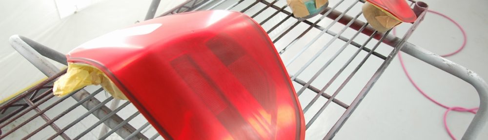 レンズの角にヒビが入っていたので、それを一旦取り外して透明エポキシ接着剤で修理しました。透明なままだとそれが見えてしまうので、スモークを塗って目立たなくしよう!(そして販売しよう)という作戦です。