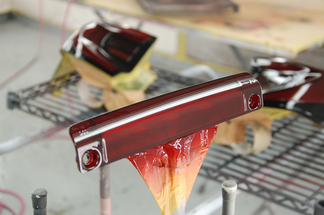 そして再びテールランプです。最初に塗ったレッド&オレンジの部分をマスキングし、その他の部分にプラスチックプライマーを塗布→スモーク塗装を行います。
