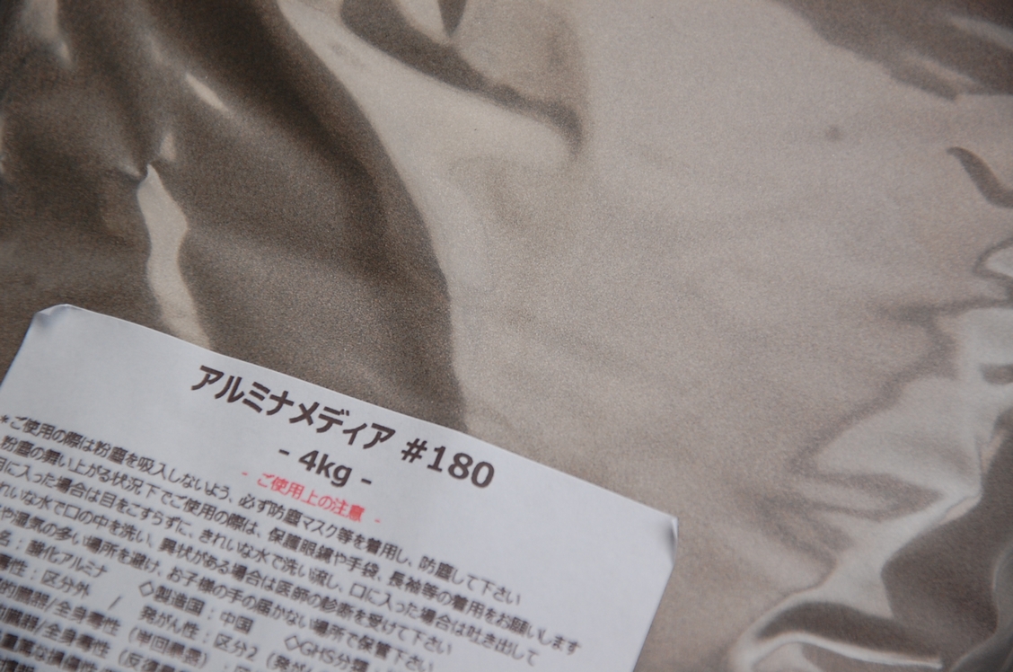アルミナ#180で、いつも使っているガーネット(#50くらい)に比べて目が細かいのが特徴です。これを直圧用のタンクに入れて使います。