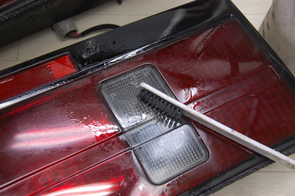 FC3Sのテールランプはゴムモールが取れ掛かっていたので一旦外してしまい、残った両面テープを除去しておきます。