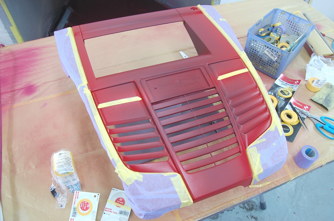 その後エンジンカバーをフェラーリロッソコルサ(カラーコード:300)に塗ります。中央は黒なので塗る必要は無いのですが、ミストが粉っぽくなって密着不良の原因になるので、途中1コートだけ一緒に塗っています。