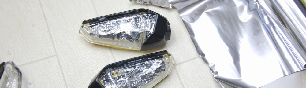 先日より下準備を行っているレンズ系のパーツです。カワサキZX6Rのウィンカーレンズはレンズ単体のパーツで、そのままマスキングテープを貼ると光が遮断されてしまい、塗っている時にスモークの濃さが判らなくなってしまう為、仮想リフレクターとして、反射フィルムを貼ってからマスキングを行います。
