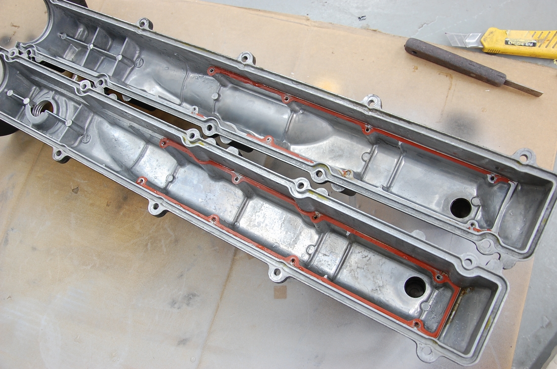 プラグカバーとタイミングベルトカバーの裏に塗ってあるシーラーは再利用する為、カッターで丁寧に剥がして保管しておきます。
