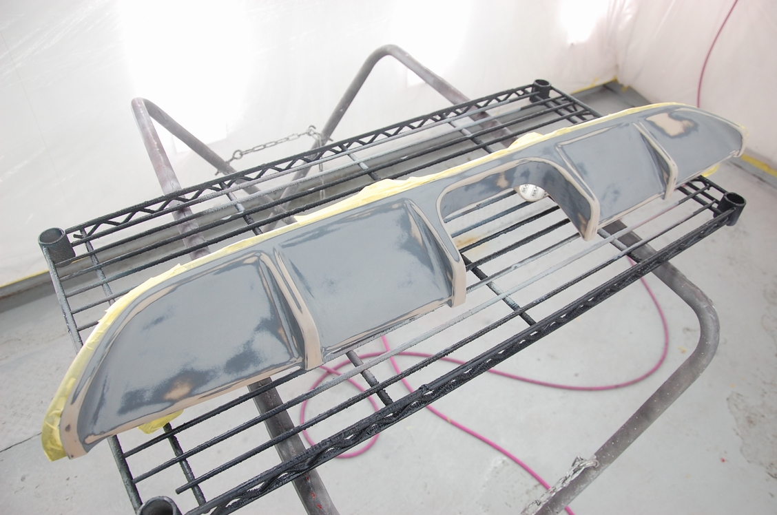 ちなみにこちらの素材はPU=ポリウレタンで、この樹脂は塗装との相性が良いのでプラスチックプライマーを塗る必要は無いのですが、成型時に違う樹脂が混合(混入)されている恐れがあるので、念のためプライマーを塗っておきます(と言う事が昔VOLVOのパーツで色々あったらしく、「タカハタさん、一応塗っておいてください」とデモマンに言われた事があります)。