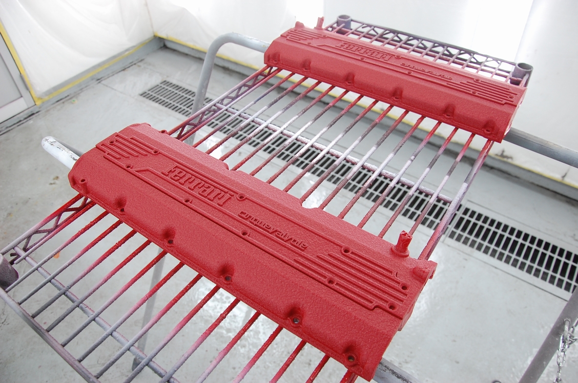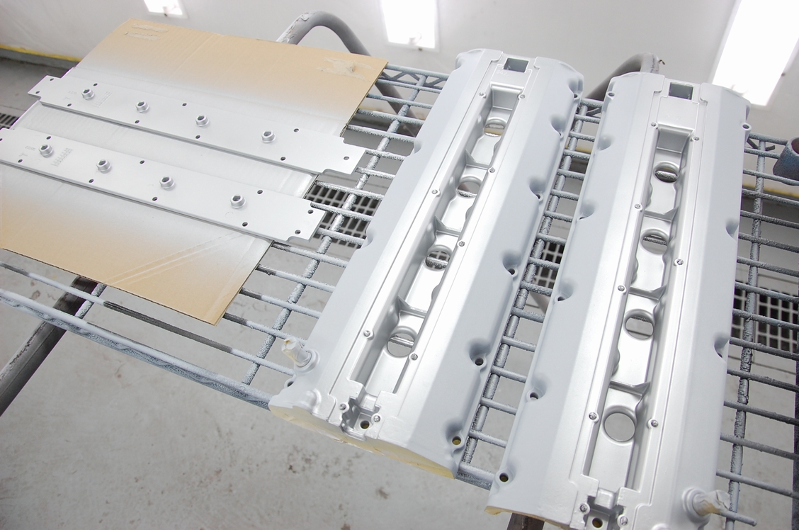 別々に塗ると塗膜の厚みの違いから結晶目(チヂレ目)が変わってしまうので、この型のヘッドカバーはいつもこのように重ねた状態にして上塗りを行っています。