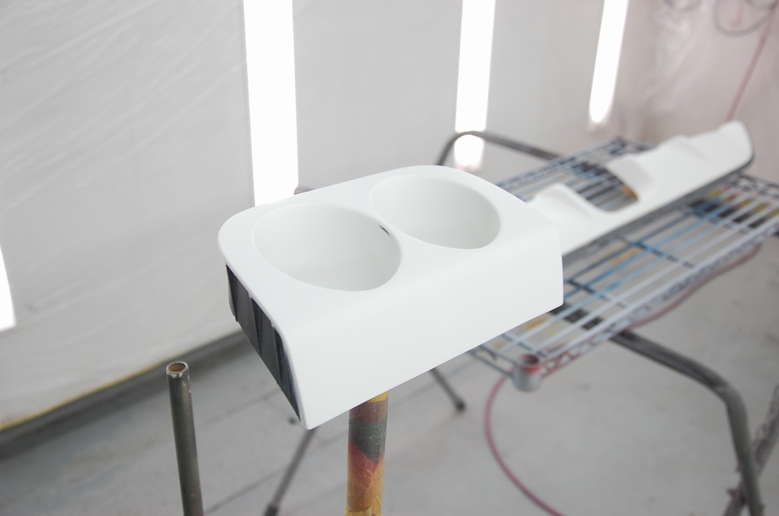 先日サーフェサーを塗っておいたスマート用BRABUS製のリヤディフューザーとセンターモールドです。その後60℃40分程の熱を掛けて塗膜を硬化させ、ガイドコートとしてベースコートの黒をパラパラと塗っておきました。