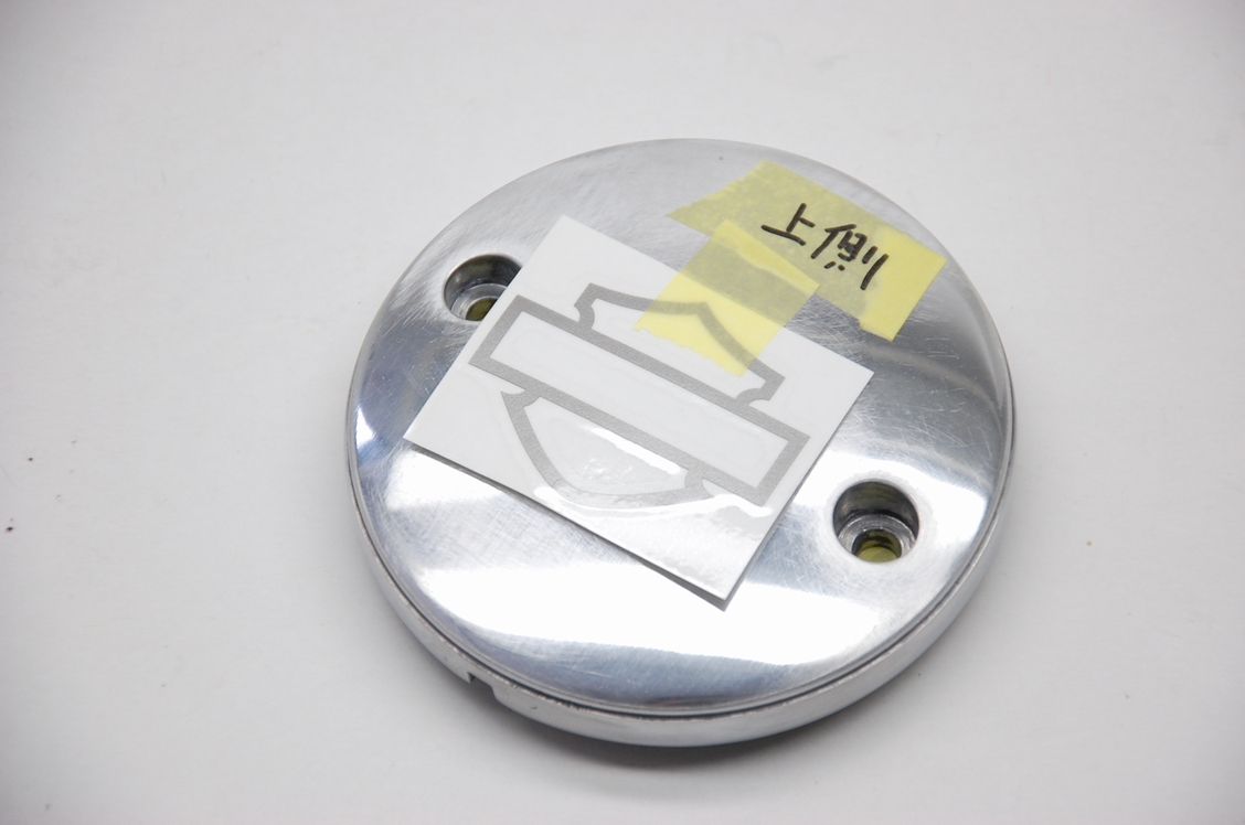 プライマリーカバーには、こちらのロゴ入れも承っております。似たようなデータを探したのですが微妙に形が違うので、同梱して頂いたシールを基にしてデータを作成しようと思います。本体のベース色は以前ご依頼頂いた時と同じくSTANDOX MIX854(黒)で、ロゴはスズキのミディアムグレー(カラーコード:ZVL)、クリアーは高品位なタイプのクリスタルクリアーの仕様で承っております。