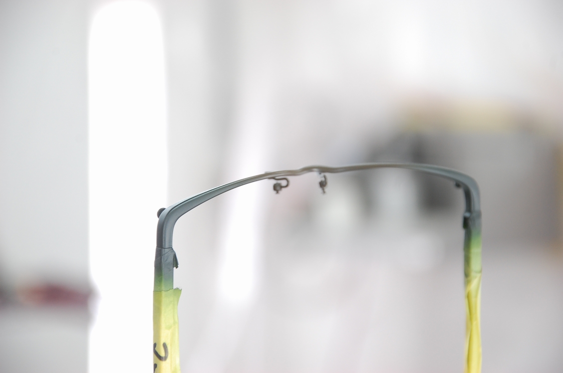 こちらのフレームは蝶番が分解出来ない構造の為、フロントとテンプルそれぞれ別けて塗装を行います。まずはフロントからですね。