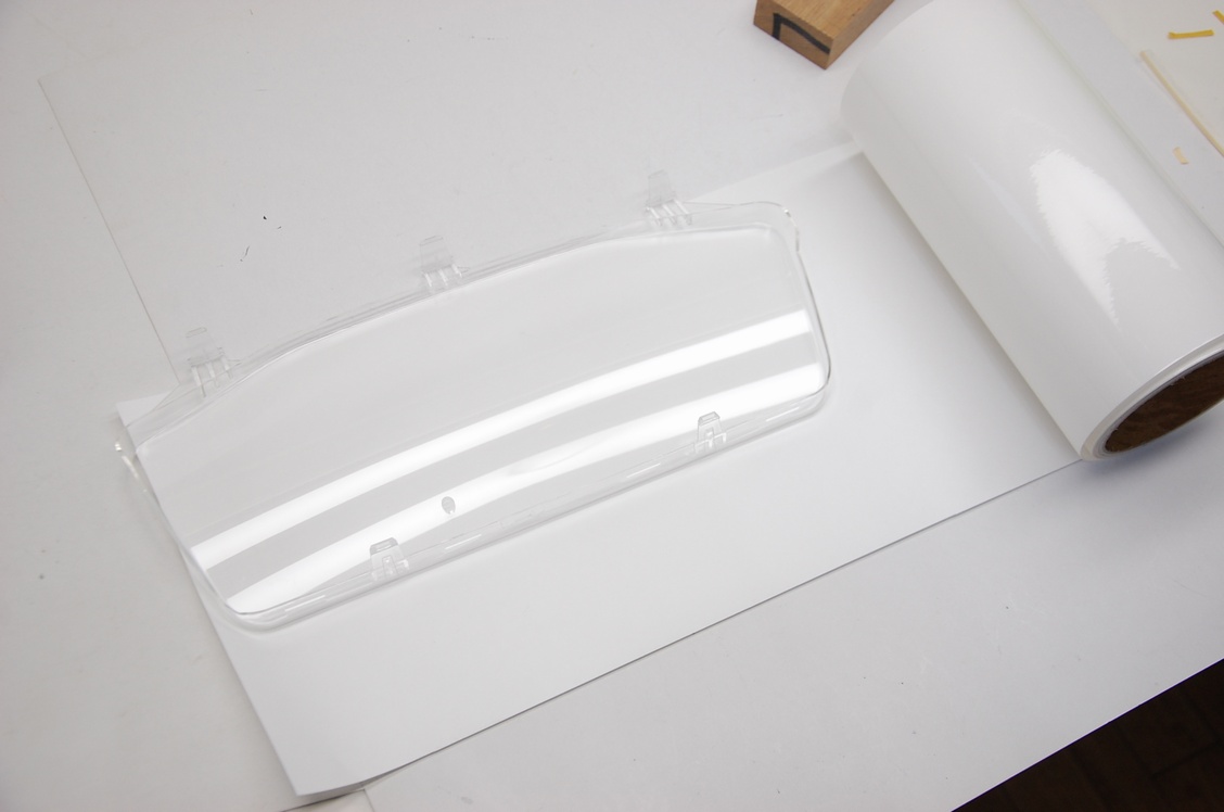 透明パネルで手間が掛かるのがこのマスキングで、土台とレンズが一体になったテールランプであれば土台部分を養生紙で覆うだけですが、透明なレンズでそれをすると塗っている時にスモーク濃度が判らなくなってしまう為、透明なフィルムでマスキングを行う必要があります。
