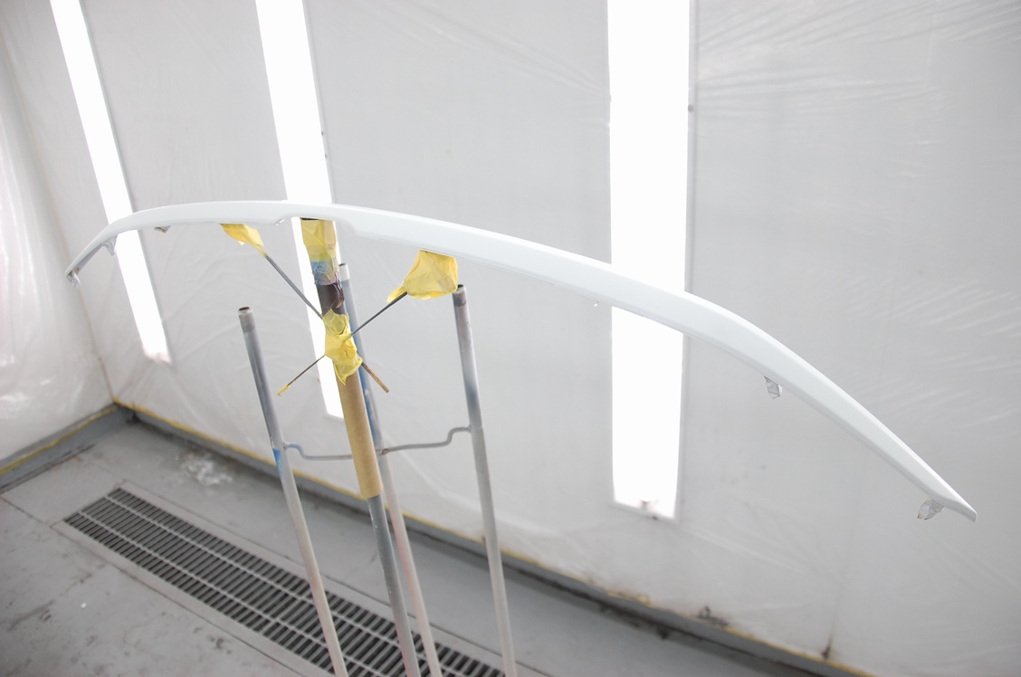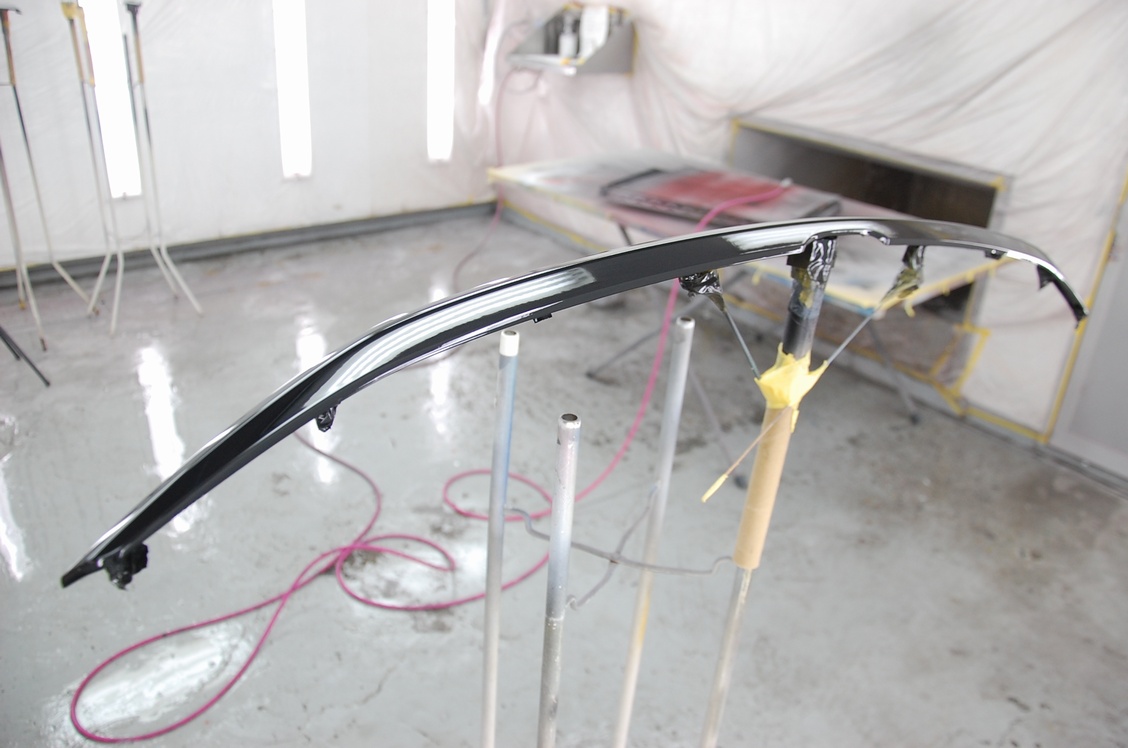 まずはベースコートを塗布します。色は前回ご依頼頂いたリヤメッキガーニッシュと同様、ホンダ純正色「クリスタルブラックパール」(カラーコード:NH731P )となります。