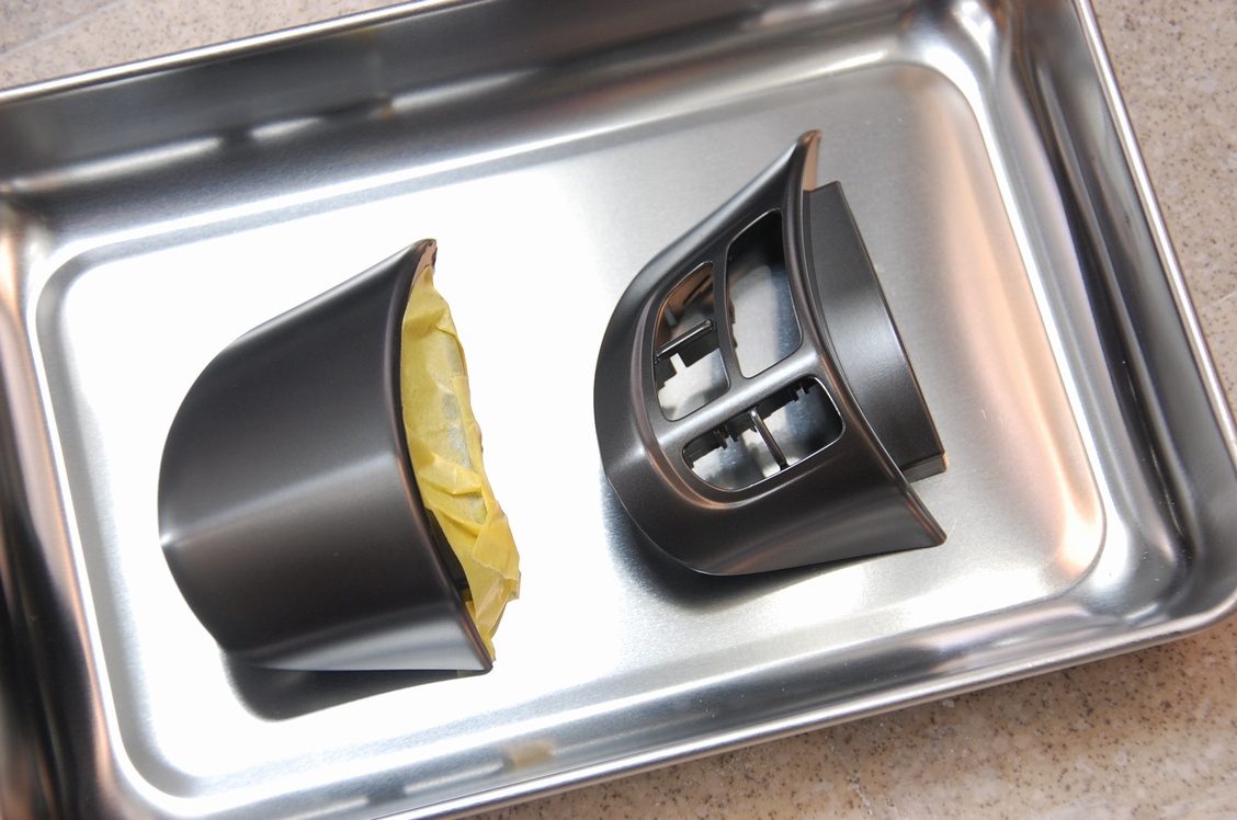 先日下塗りを行っていたスバルインプレッサ用ステアリングスイッチカバー(リモコンカバー)と、色の見本としてお預かりしたステアリングスポークカバーです。その後60℃40分程の熱を掛けて塗膜を硬化させておきました。